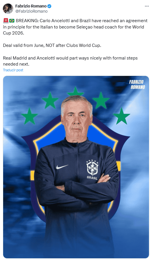 El técnico italiano Carlo Ancelotti no continuará al frente del Real Madrid. El estratega ya habría tomado la decisión de dejar su cargo en el banquillo del conjunto merengue para aceptar la propuesta de ser el estratega de la Selección de Brasil, en el proceso para la Copa del Mundo del 2026.De acuerdo con medios brasileños, a lo largo de esta semana Ancelotti se marchará del Real Madrid y emprenderá su viaje a Sudamérica para firmar su contrato con el "Scratch".Las mismas fuentes aseguran, que lo único que faltan arreglar, es el tiempo que firmará. La intención de Carlo Ancelotti es tener un contrato que se extienda hasta junio de 2030.El italiano se marchará del Real Madrid con 15 títulos entregados en sus diferentes etapas, siendo el entrenador más laureado en la historia del equipo.La información sobre la firma de Ancelotti también fue respaldada por el periodista experto en fichajes, Fabrizio Romano.Pese a que han sonado varios candidatos para asumir las riendas del conjunto "Merengue", el más adelantado sigue siendo Xabi Alonso, quien quedará libre al final de la temporada con el Bayer Leverkusen de la Bundesliga.*Mantente al día con las noticias, únete a nuestro canal de WhatsAppOF