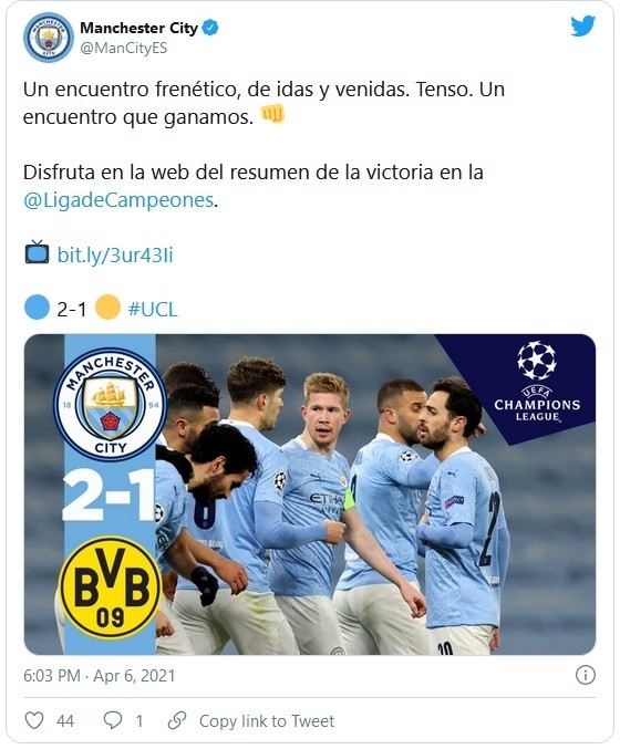 El Manchester City derrotó por 2-1 al Borussia Dortmund, este martes en Inglaterra, y toma ligera ventaja de cara a la vuelta de los cuartos de final de la Liga de Campeones, el próximo miércoles en Alemania.El belga Kevin de Bruyne (19) adelantó al líder de la Premier League, Marco Reus empató para los alemanes a poco para el final (84), pero Phil Foden dio la victoria al equipo de Pep Guardiola sobre la bocina (90)."Hemos luchado hasta el final con todas las fuerzas, es muy frustrante encajar un gol al final del partido", lamentó el veterano central Mats Hummels.Ese segundo gol "era evitable, pero hemos hecho un buen partido tácticamente y esto nos debería dar confianza" para la vuelta, explicó por su parte el goleador germano, Marco Reus.El City, que sigue aspirando a cuatro títulos esta temporada, confirmó pronto su cartel de favorito de esta eliminatoria ante un Dortmund que se presentó en el Etihad Stadium sin tres de sus pilares, el mediocentro belga Axel Witsel, el enganche inglés Jadon Sancho y la joven perla Youssoufa Moukouko.JM