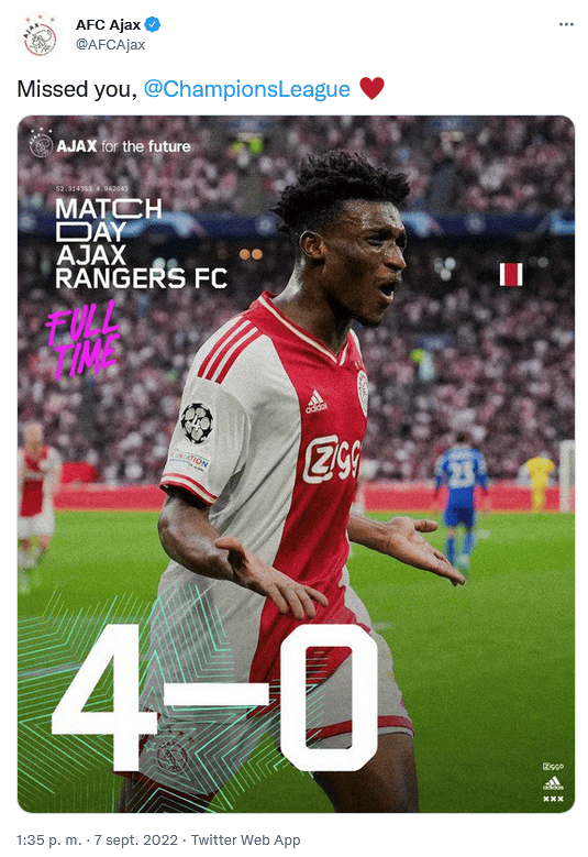 Este miércoles, el Ajax de Holanda arrancó la temporada 2022-2023 de la Champions League con victoria de 4-0 sobre el Rangers.El mexicano Edson Álvarez anotó a los 17 minutos de iniciado el partido, cuando apareció solo en el área de los británicos y marcó de cabeza para darle el 1-0 a los suyos.El ex jugador del América salió de cambió al minuto 89, cuando el lateral mexicano Jorge Sánchez entró para hacer su debut en el torneo de futbol más prestigioso de la UEFA.El técnico Alfred Schreuder traslada así a la Champions League las buenas sensaciones de su equipo, líder indiscutible en la Eredivisie de Países Bajos, donde ha ganado los cinco primeros partidos de la temporada.Los otros goles del partido fueron obra de Steven Berghuis al '32, Mohammed Kudus al '33, y Steven Berwijn al '80.El Rangers, que llevaba desde 2010 sin participar en la Champions, encaja así una contundente goleada en un grupo en el que cada punto y gol puede ser decisivo en las jornadas finales.Con información de AFPOF