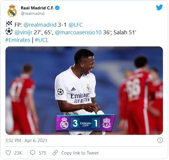 De la mano de un doblete de Vinicius Junior, el Real Madrid doblegó el martes 3-1 al Liverpool en el partido de ida de los cuartos de final de la Liga de Campeones.El delantero brasileño abrió el marcador a los 27 minutos tras un pase de Toni Kroos a las espaldas de dos zagueros del club inglés. Vinicius selló una notable noche al facturar el tercer gol merengue a los 65.En un aplastante primer tiempo y tras otro desbarajuste defensivo del rival, Marco Asensio anotó el otro tanto del Madrid a los 36.Los anfitriones supieron gestionar la segunda parte para sacar una buena ventaja con miras al choque de vuelta en Inglaterra.Mohamed Salah descontó para Liverpool en el inicio del complemento.Fue la revancha de la final de la Champions de 2018, ganada por el Madrid. Pero el club español naufragó en los octavos de finales de las dos ediciones posteriores. Liverpool se alzó con el título al año siguiente de la derrota ante los merengues, pero fue eliminado en octavos la pasada temporada.JM