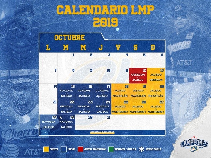 Charros de Jalisco, el campeón de la Liga Mexicana del Pacífico (LMP), ya tiene lugar y fecha para comenzar la defensa de su título en la próxima Temporada Caliente 2019-2020 del beisbol invernal del paísY es que hoy martes la novena tapatía dio a conocer su calendario de juegos, el cual arrancará el próximo 12 de octubre recibiendo a los Yaquis de Ciudad Obregón, equipo al que doblegó en la serie final por el título de la temporada pasada.En total Charros de Jalisco disputará, como parte del rol regular, 34 juegos como local y 34 juegos como visitante, siendo el 29 de octubre el único día en el que los caporales alberguen un juego doble, esto contra Mayos de Navojoa.Entre los compromisos especiales para Charros está la serie que arrancará el 15 de octubre, fecha en que se medirá a los Algodoneros de Guasave por primera vez desde que los tapatíos reaparecieron en la escena del beisbol profesional mexicano.De la misma forma, el 25 de octubre también será un día para enmarcar, pues Charros visitará por primera vez la Sultana del Norte para meterse al Estadio de Beisbol Monterrey en su intento de llevarse su primera serie frente a los Sultanes.La segunda vuelta de esta temporada arrancará el 22 de noviembre, día en que Venados de Mazatlán visitará el parque de pelota de Zapopan para medirse a la tropa blanquiazul.Asimismo, el último juego de Charros en el rol regular será contra Tomateros de Culiacán, rival al que visitarán del 28 al 30 de diciembre. RR
