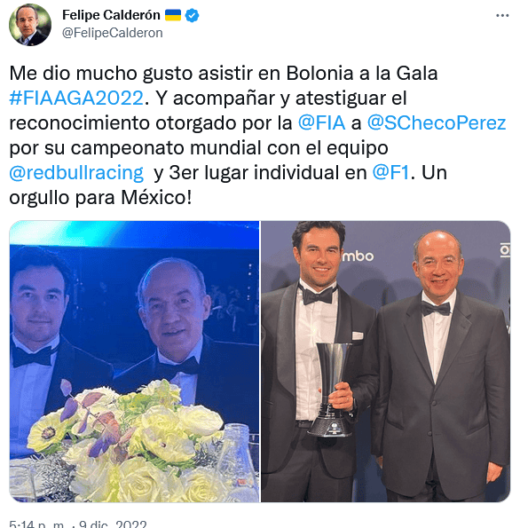 El mexicano Sergio "Checo" Pérez fue galardonado en la ceremonia anual de la FIA donde se reconoce a lo mejor de la temporada de la Fórmula 1 (F1).En la temporada 2022, Checo Pérez terminó en la tercera posición del campeonato de pilotos y ayudó a Red Bull a conquistar el campeonato de constructores, por ello el mexicano fue uno de los galardonados.El piloto tapatío estuvo acompañado de su esposa Carola Martínez, también celebró este reconocimiento con el expresidente de México, Felipe Calderón.Calderón Hinojosa fue el encargado de compartir el momento en su cuenta de Twitter."Me dio mucho gusto asistir a Bolonia a la Gala FIA y acompañar y atestiguar el reconocimiento otorgado por la FIA a Checo Pérez por su campeonato mundial con el equipo Red Bull y el 3er lugar individual en Fórmula 1", escribió Calderón."¡Un orgullo para México!", consideró el expresidente.Calderón además del mensaje publicó un par de fotos donde se le observa en la mesa junto a "Checo" Pérez.OF