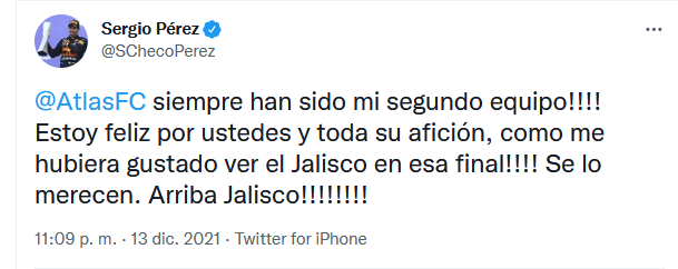 El piloto de F1 Sergio "Checo" Pérez tiene un equipo favorito en el futbol mexicano y ese es las Águilas del América. Sin embargo, ya se sabe cuál de los dos tapatíos en Primera División es al que elige entre Atlas y Chivas."Checo" Pérez culminó el domingo su primer año con la escudería Red Bull, y cerró en el cuarto lugar en el campeonato de pilotos con 190 puntos, el mejor en su carrera en la F1. Un día después, el jalisciense aprovechó sus redes sociales para dejarle un mensaje en Twitter al equipo que terminó como campeón del Torneo Apertura 2021 de la Liga MX, lo que ha desatado reacciones de todos tipos, pues aseguró que Atlas siempre ha sido su segundo equipo.En su cuenta de Twitter, "Checo" Pérez escribió: "@AtlasFC siempre han sido mi segundo equipo!!!! Estoy feliz por ustedes y toda su afición, como me hubiera gustado ver el Jalisco en esa final!!!! Se lo merecen. Arriba Jalisco!!!!!!!!".El domingo, horas después de un emocionante Gran Premio de Abu Dabi, en el que finalmente se impuso en la última vuelta el neerlandés Max Verstappen y se coronó campéon del mundo, Atlas venció en penales al León y culminó una sequía de 70 años sin título. Muchos atletas, entre ellos "Checo" Pérez han expresado sus felicitaciones, dedicando emotivos mensajes para el equipo y para su afición.OF