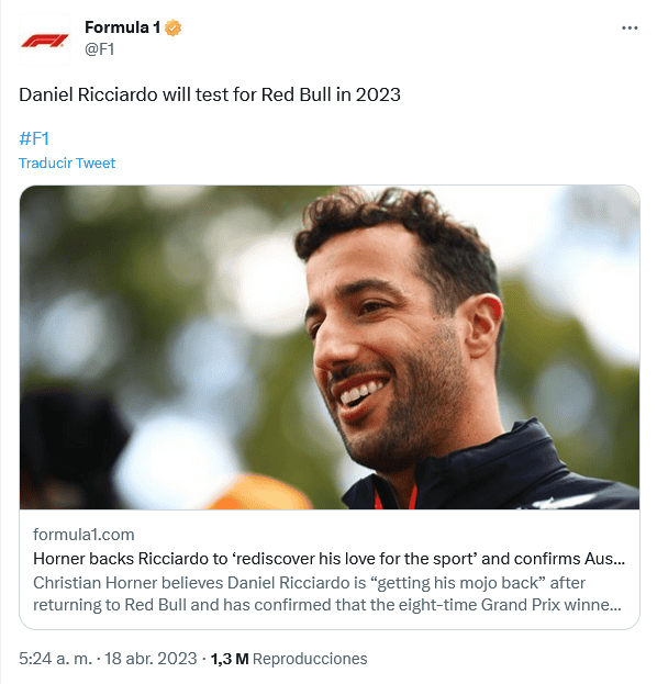 "¿Tomará el lugar de Checo Pérez?". Así cuestionan aficionados la noticia que fue confirmada esta mañana por el jefe de Red Bull, Christian Horner, que el australiano Daniel Ricciardo sigue pensando únicamente en regresar a la Fórmula 1 (F1) y que hará tests con el equipo.Después de varios años fuera de Red Bull, el oceánico regresó al equipo del que se fue con buenas relaciones. Sobre su regreso como tercer piloto, Christian Horner se mostró contento de tenerlo de vuelta."Daniel es simplemente una energía positiva y es genial verle recuperar su energía, ver esa gran sonrisa en su cara, ilumina una habitación cuando entra", dijo Horner en una publicación de la página oficial de la F1."Su popularidad en la Fórmula 1... Aunque no esté pilotando, sigue siendo probablemente el piloto más popular aquí, y para nosotros es positivo tenerle en el equipo, contribuyendo al equipo, a los pilotos, al equipo de ingenieros".Cuando se anunció su regreso a Red Bull, se estableció que Ricciardo sería tercer piloto y el mismo conductor lo ha tomado bien. Sin embargo, también se dijo que haría unos tests para ponerlo a prueba en pista, y sobre eso, Horner dijo que lo que espera es que "redescubra su amor por este deporte"."Espero que redescubra su amor por este deporte. Hará algunas pruebas para nosotros a finales de año y veremos cómo le va. Pero creo que es una experiencia diferente. Se ha lanzado y está adoptando este nuevo papel"."¡Yo diría que le faltan unos 10 minutos para estar listo!", bromeó Horner sobre el regreso de Ricciardo a las pistas. "Está en buena forma; se ha mantenido en forma y bien. Creo que se está entrenando duro y que está listo si se le da la oportunidad", concluyó el dirigente británico.Luego de que corriera la tercera carrera de la temporada 2023 de la Fórmula 1 (F1), el Gran Premio de Australia, en la que el vencedor fue el neerlandés Max Verstappen, el bicampeón del mundo se mantiene a la cabeza con 69 puntos; por su parte, Checo Pérez es segundo, con 54 unidades.En la clasificación de constructores, Red Bull se colocó a la cabeza con 123 puntos por el buen trabajo que han realizado tanto Verstappen como el propio Sergio "Checo" Pérez, quien este año ha demostrado que puede pelear por el título de campeón.OF
