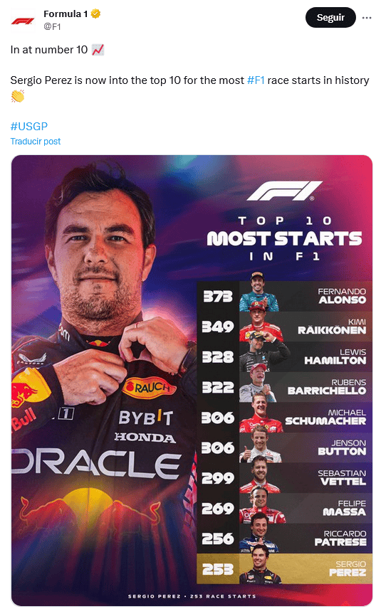 El pasado fin de semana en el Gran Premio de Estados Unidos 2023, y a unos días de que se corra el Gran Premio de México, el tapatío Sergio "Checo" Pérez entró en una lista de privilegio en la Fórmula 1 (F1).Al iniciar en el Circuito de Las Américas de la ciudad de Austin, Texas, el veterano Checo Pérez se convirtió en el décimo piloto con más carreras en la historia de la F1 con 253.Checo ha corrido 13 años en la máxima categoría del automovilismo y ya se codea con los mejores de la historia. En esa lista de pilotos con más apariciones están Fernando Alonso (que actualmente corre para McLaren) que lidera con 373 carreras; le sigue Kimi Raikkonen con 349 competencias; detrás está el múltiple campeón del mundo Lewis Hamilton, con 328; Rubens Barrichello con 322; Michael Schumacher y Jenson Button con 306; Sebastian Vettel con 299; Felipe Massa con 269 y Ricardo Patrese con 256. El mexicano, que ha pilotado para Red Bull las últimas temporadas, sacó de esta lista al italiano Jarno Trulli, que salió a competencia en 252 ocasiones entre 1997 y 2011.En la actual temporada de F1, con 240 puntos, Checo Pérez es sublíder del campeonato de pilotos, sólo por detrás de su compañero, el tricampeón mundial Max Verstappen.*Mantente al día con las noticias, únete a nuestro canal de WhatsAppOF