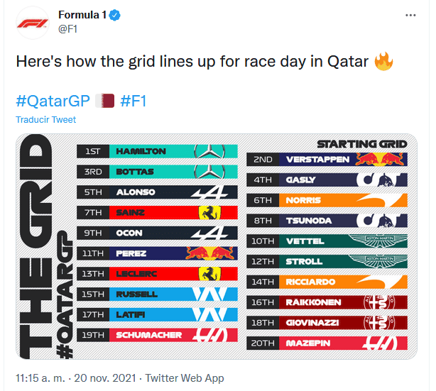 El mexicano Sergio Pérez (Red Bull) quedó eliminado este sábado en la segunda ronda (Q2) de la calificación para el Gran Premio de Qatar, antepenúltimo del Mundial de F1, que se disputa en el circuito de Losail.El siete veces campeón del mundo, el inglés Lewis Hamilton (Mercedes), arrancará primero mañana domingo, tras haber dominado este sábado la calificación.Hamilton elevó a 102 su propio récord histórico de "poles" en F1 al cubrir la pista en un minuto, 20 segundos y 827 milésimas, 455 menos que el neerlandés Max Verstappen (Red Bull), líder del Mundial, con 14 puntos de ventaja sobre él en el campeonato. Los españoles Fernando Alonso (Alpine) y Carlos Sainz (Ferrari) arrancarán quinto y séptimo, respectivamente, tras haber acabado en esos puestos la cronometrada principal.El mexicano "Checo" Pérez saldrá undécimo en Qatar.Desde la segunda fila saldrá Valtteri Bottas -compañero de Hamilton-, como tercero; y el francés Pierre Gasly (Alpha Tauri), cuarto.En la tercera, al lado de Fernando Alonso, tomará la salida el inglés Lando Norris (McLaren); mientras que la cuarta hilera, la de Sainz, se completará con el japonés Yuki Tsunoda (Alpha Tauri), que saldrá octavo, al lado del piloto madrileño.Desde la quinta fila de la parrilla de salida de la carrera de este domingo arrancarán el francés Esteban Ocon, compañero de Alonso en Alpine, que acabó noveno la sesión de calificación; y el cuádruple campeón mundial alemán Sebastian Vettel (Aston Martin).OF