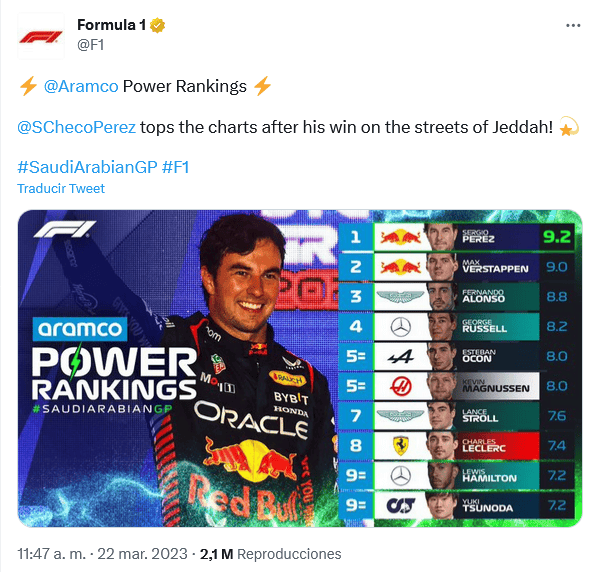 Sergio "Checo" Pérez fue el gran ganador el pasado fin de semana en el Gran Premio de Arabia Saudita 2023, que le hizo llegar a 5 triunfos en la Fórmula 1 (F1) en sus 12 años en la categoría reina del automovilismo.Después de conseguir la victoria, el jalisciense fue elegido por los expertos de la F1 como el líder de los rankings de Aramco, en el que se califica el desempeño de cada piloto a lo largo del fin de semana.Resulta extraño porque en esta calificación de cinco expertos por lo regular el mexicano no es bien calificado, e incluso la afición ya lo toma a broma, porque no es el único que sufre con esa lista.Pero por increíble que parezca, el de Guadalajara acabó en el primer lugar de esta polémica tabla, lo que dejó con la sorpresa a todos sus seguidores en las redes sociales.El triunfo del pasado fin de semana pone a Checo Pérez en la pelea por el campeonato, aunque claro, es muy temprano, pues apenas se disputó la segunda fecha del calendario 2023 de la F1.OF