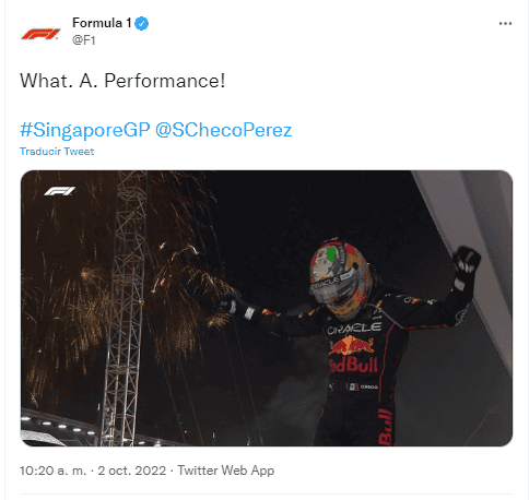 El piloto mexicano Sergio "Checo" Pérez, que había iniciado en el segundo lugar, se impuso este domingo en la lucha al monegasco de Ferrari Charles Leclerc y ganó el Gran Premio de Singapur 2022 de Fórmula 1 (F1).La carrera en el circuito de Marina Bay estuvo marcada por un retraso por lluvia, y los abandonos de varios pilotos que no pudieron seguir en la competencia.De principio a fin, no hubo oponente enfrente de él en ningún momento. El piloto tapatío "Checo" Pérez hizo despertar de buenas a todo México, luego de ganar el Gran Premio de Singapur; tras la luz verde del inicio, pasó al Ferrari de Charles Leclerc y ya no soltó la punta. En el tercer lugar en el podio culminó también el español Carlos Sainz Jr.Aunque la dirección de carrera informó de una posible penalización por una infracción en el safety car, el tapatío logró sacarle más de 7 segundos a Charles Leclerc lo que le aseguraría el triunfo aún con penalización.Se trata del cuarto triunfo en F1 en la carrera del mexicano "Checo" Pérez, luego del GP de Baréin en 2020 (otra carrera nocturna), el GP de Azerbaiyán en 2021, y el GP de Mónaco esta temporada (otra carrera urbana).En el GP de Singapur se vivió un duelo intenso mano a mano con el monegasco Leclerc, que intentó ejecutar rebases desesperados, pero "Checo" los contuvo, sobre todo en las últimas tres vueltas, en donde se mantuvo el nervio a flor de piel.La mala fortuna del fin de semana fue para el campeón del mundo Max Verstappen, ya que el neerlandés, por principio de cuentas, arrancó desde el octavo puesto en la parrilla de salida; al momento de la largada perdió cinco posiciones y durante la carrera tuvo una serie de problemas en donde incluso perdió el control en una de las curvas, sin embargo, no pasó a mayores y el piloto de Red Bull, que se encamina a lograr el bicampeonato, finalizó en la séptima posición en una de las carreras más accidentadas del campeonato.Y es que los pilotos Yuki Tsunoda, Esteban Ocon, Alexander Albon, Fernando Alonso, Nicholas Latifi y Zhou Guanyu ni siquiera pudieron finalizar la carrera, la cual concluyó en 59 giros de los 61 que se tenían pactados, pero la dirección de carrera determinó que finalizara con cronómetro a contrarreloj y no por número de vueltas.Tras el resultado del Gran Premio de Singapur, Sergio Pérez Mendoza se acerca peligrosamente a Charles Leclerc en el campeonato mundial de pilotos y la lucha por el subcampeonato está al rojo vivo, ya que el tapatío llegó a 235 puntos por 237 del monegasco. Además, Max Verstappen, al finalizar en séptimo puesto, solo sumó seis puntos, llegando así a 341.La siguiente parada del Gran Circo de la máxima categoría del automovilismo será la próxima semana en el Gran Premio de Japón en el Circuito de Suzuka, en donde podría definirse el campeón de esta temporada 2022 en la figura del neerlandés Max Verstappen.1.- Sergio Pérez / Red Bull 2.- Charles Leclerc / Ferrari 3.- Carlos Sainz / Ferrari 4.- Lando Norris / McLaren 5.- Daniel Ricciardo / McLaren 6.- Lance Stroll / Aston Martin 7.- Max Verstappen / Red Bull 8.- Sebastian Vettel / Aston Martin 9.- Lewis Hamilton / Mercedes 10.- Pierre Gasly / AlphaTauri OF