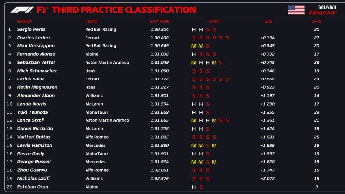 El piloto mexicano de Fórmula 1 (F1) Sergio "Checo" Pérez (Red Bull) fue el más rápido este sábado, por delante del monegasco Charles Leclerc (Ferrari), líder del Mundial 2022, en el tercer y último entrenamiento libre para el debutante Gran Premio de Miami, en Estados Unidos, el quinto del campeonato, que se disputa en el circuito construido alrededor del Hard Rock Stadium de la citada localidad de Florida.En su mejor vuelta, "Checo" cubrió los cinco mil 412 metros de la nueva pista de Miami en un minuto, 30 segundos y 304 milésimas, 194 menos que Leclerc; en una sesión en la que el otro Red Bull, el del neerlandés Max Verstappen, último campeón del mundo, marcó el tercer tiempo -a 345- y el doble campeón mundial español Fernando Alonso (Alpine) el cuarto, a 732 milésimas del mexicano. Todos ellos, con el neumático blando.La sesión estuvo interrumpida durante casi un cuarto de hora, con bandera roja, a causa del accidente, sin mayores consecuencias, del francés Esteban Ocon, el compañero del doble campeón mundial asturiano, que perdió el control de su Alpine en la decimocuarta de las 19 curvas de la pista de la Florida, en la que se rueda en sentido inverso al de las agujas del reloj.OF