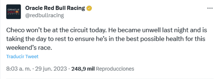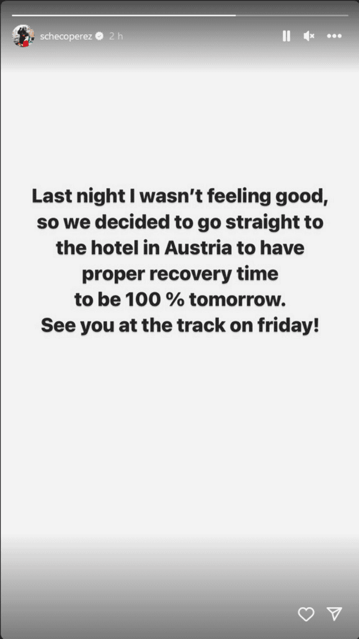 La actividad en la pista de la Fórmula 1 (F1) regresa este fin de semana para darle paso al GP de Austria 2023, un circuito de suma importancia para el piloto mexicano Sergio "Checo" Pérez.Lamentablemente, el miembro de la escudería Red Bull, previo a iniciar la actividad, tuvo malestares, y él mismo confirmó que espera pueda recuperarse pronto para reaparecer mañana viernes."Checo no estará hoy en el circuito. Se sintió mal anoche y se está tomando el día para descansar para asegurarse de que está en la mejor salud posible para la carrera de este fin de semana", compartió la escudería en sus redes sociales.Después de darse a conocer la noticia de su ausencia el día de hoy en el GP de Austria, "Checo" Pérez no dudó en compartir una explicación de lo que pasó.Fue en sus historias de Instagram que contó que no se sentía bien."Anoche no me sentí bien, así que decidimos ir directamente al hotel en Austria para tener el tiempo adecuado de recuperación para estar al 100% mañana. Nos vemos en la pista el viernes!", dijo.Durante los próximos cinco fines de semana, se disputarán en la F1 cuatro de los 22 Grandes Premios de un Mundial 2023, que se cerrará el 26 de noviembre, en Abu Dabi. OF