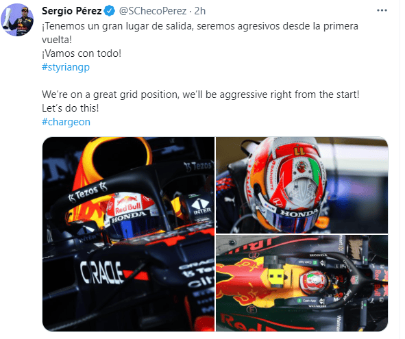 El piloto mexicano Sergio "Checo" Pérez, que arrancará desde el cuarto puesto en el Gran Premio de Estiria, lanzó un contundente mensaje en sus redes sociales luego de la clasificación este sábado."Checo" aseguró que saldrá de forma agresiva para la carrera, en busca de escalar posiciones y mantenerse en la cima."Tenemos un gran lugar de salida, seremos agresivos desde la vuelta 1. ¡Vamos con todo!". El tapatío culminó en quinto puesto tras la clasificación, pero una sanción al finlandés Valtteri Bottas le permitió ascender al cuarto puesto.El GP de este domingo es uno de los dos en territorio de Red Bull. AJ