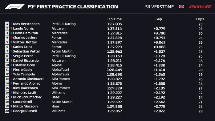 El mexicano Sergio ''Checo'' Pérez terminó en la octava posición, mientras que su compañero en Red Bull, el holandés Max Verstappen, marcó el mejor tiempo este viernes en la primera práctica libre para el Gran Premio de Gran Bretaña (GP de Gran Bretaña), el décimo del Mundial de Fórmula Uno (F1), que se disputa en el circuito inglés de Silverstone.Verstappen cubrió, con neumático blando, los cinco mil 891 metros de la mítica pista inglesa en un minuto, 27 segundos y 35 milésimas, 779 menos que Lando Norris (McLaren) -con medio- y con 780 de ventaja sobre otro inglés, el séptuple campeón del mundo Lewis Hamilton (Mercedes) -segundo en el Mundial, a 32 puntos-, que logró su mejor crono con idéntico compuesto que el neerlandés. ''Checo'' Pérez terminó con un tiempo de 1:28.163. Más tarde se disputará una sesión cronometrada que decidirá los puestos de salida de la primera calificación de la historia de la F1 que se decidirá este sábado a través de una prueba sprint (17 vueltas, poco más de cien kilómetros), que será la que ordene la formación de salida de la carrera dominical.OF
