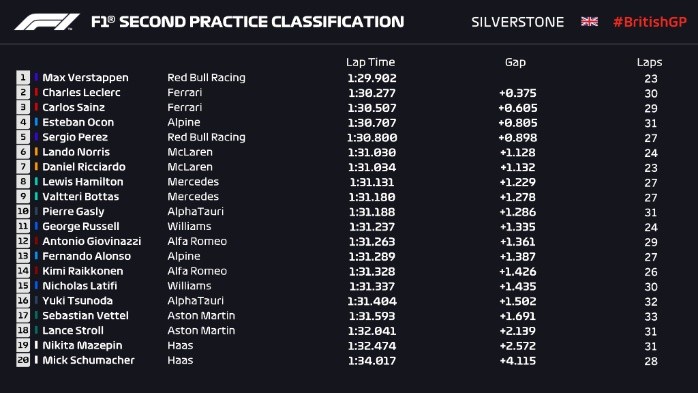 El neerlandés Max Verstappen (Red Bull), líder del campeonato, marcó el mejor tiempo este sábado en el segundo ensayo libre para el Gran Premio de Gran Bretaña, el décimo del Mundial de Fórmula Uno, que se disputa en el circuito inglés de Silverstone; donde en unas horas se decidirá la primera calificación de la historia a través de una carrera sprint. El mexicano Sergio "Checo" Pérez (Red Bull) marcó el quinto tiempo, con medios. En la mejor de sus 23 vueltas, Verstappen cubrió, con neumático medio, los cinco mil 891 metros de la mítica pista inglesa en un minuto, 29 segundos y 902 milésimas, 375 menos que el monegasco Charles Leclerc (Ferrari), con idéntico compuesto que el líder; en una sesión en la que el español Carlos Sainz, compañero del anterior y que dio 29 vueltas, firmó el tercer tiempo, con blando, a seis décimas del neerlandés.En el mejor de sus 27 giros, el tapatío "Checo" Pérez se quedó a casi nueve décimas de su compañero holandés.El español, el doble campeón mundial asturiano Fernando Alonso (Alpine), marcó el decimotercer tiempo de una sesión soleada, que acabó con 25 grados centígrados ambientales y 47 en el asfalto, en la que no se registraron incidencias reseñables.Alonso repitió 27 veces el trazado de la pista en la que ganó dos veces (2006, con Renault; y 2011, con Ferrari) y en su mejor intento se quedó, con neumático blando, a un segundo y tres décimas del crono de Verstappen.El séptuple campeón del mundo Lewis Hamilton (Mercedes, segundo en el Mundial, a 32 puntos de Verstappen), marcó el octavo tiempo del entrenamiento, con el compuesto blando -a un segundo y 229 milésimas del neerlandés- en la mejor de sus 27 vueltas.Hamilton saldrá primero, en la primera sesión de calificación de la historia de la F1 que se decidirá mediante una prueba sprint. Prevista a 17 vueltas y cien kilómetros: un tercio de la carrera dominical."Checo" saldrá quinto en esta prueba corta, mientras que los españoles Sainz y Alonso buscarán asimismo adelantar puestos en la parrilla de la carrera del domingo desde la novena y la undécima posición este sábado.OF