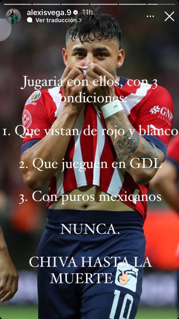 El día de ayer, Alexis Vega habló en el día de medios previo al Clásico Nacional contra el América, admitiendo que no le convenía cerrarle las puertas al club azulcrema. "Es el caso de Oribe (Peralta). Estamos en una institución y puede llegar a ofrecer América, y si no tengo otra opción para dónde ir a jugar es como ustedes, están en una televisora y si tiene una oferta de otra y es la única que tienen, obviamente la van a tomar. Es parte de nuestro trabajo, imagínate que te digo que no, luego llega una oferta del América y ya no me quieren. Yo tengo que ser un profesional en todos los sentidos, pero ahora estoy en Chivas y lo voy a disfrutar", comentó. Unas horas más tarde de dicha declaración, el atacante de 25 años publicó una imagen en redes sociales, en la que afirmaba que jugaría con ellos con 3 condiciones: El 10 rojiblanco enfatizó en el post que "NUNCA" se iría con el rival, pues va con "Chivas hasta la muerte". Vega reaparecerá en la jornada 12 contra el América, después de que en la fecha 2 del Clausura 2023 sufriera una lesión en su rodilla derecha y tuviera que pasar por el quirófano. Será este sábado a las 21:10 horas, tiempo del centro del país, cuando el conjunto comandado por Veljko Paunovic se vea las caras contra el conjunto dirigido por Fernando Ortiz en la cancha del Estadio Akron. AV