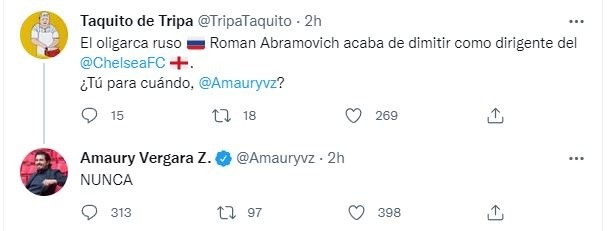 La molestia por los malos resultados del equipo cada vez se vuelve más evidente entre los aficionados de Chivas, y es por eso que aprovechan cualquier oportunidad para pedir la renuncia de algún directivo o el despido del entrenador en turno.En esta ocasión fue Amaury Vergara el blanco de las críticas por parte de los aficionados rojiblancos, pues aprovechando que Roman Abramovich dio un paso al costado del Chelsea, un usuario de Twitter cuestionó al mandamás del Rebaño para saber cuándo se haría a un lado del chiverío."El oligarca ruso Roman Abramovich acaba de dimitir como dirigente del Chelsea, ¿tú para cuándo, Amaury?", escribió un usuario de esa red social, y ante el cuestionamiento directo Amaury se limitó a responder "NUNCA".Esta noche las Chivas recibirán a Puebla en la cancha del Estadio Akron, esto en un juego que arrancará a las 19:00 horas tiempo del centro del país. JL