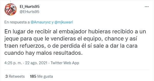 Amaury Vergara, presidente de las Chivas Rayadas de Guadalajara, compartió en redes sociales la visita de Mohammed Alkuwari, embajador de Qatar en México, al estadio Akron.Vergara publicó fotos de ambos en la cancha, así como del recorrido en las instalaciones y en un tweet reveló el motivo de la reunión."Tuvimos el gran honor de recibir en nuestro Estadio al Embajador de Qatar en México, Mohammed Alkuwar, para charlar de lo que más nos apasiona, de cara al próximo mundial. Muchísimas gracias por tu visita, Mohammed", escribió Amaury.Aficionados del Guadalajara comentaron la publicación, reclamando el mal paso del equipo en el Apertura 2021.Varias respuestas al tweet de Amaury Vergara coinciden qué debería hacer algo por el club, que no pasa por el mejor momento futbolístico. Si quieres tener más contenido, más imágenes y aún más noticias, entonces descarga INFORMAPlus, la aplicación digital de EL INFORMADOR, donde tenemos materiales exclusivos para tí.Descarga la aplicación y pruébala GRATIS por treinta días. Para iOS: https://apple.co/35jaVgbPara Android: https://bit.ly/3gwVSEVSi eres suscriptor de EL INFORMADOR tu acceso está incluido, solicítalo al 33 3678-7777JL
