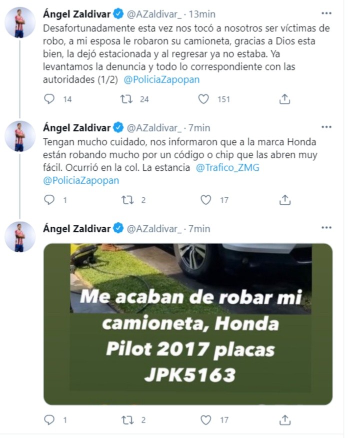 Nadie está exento de la delincuencia. El delantero de Chivas Ángel Zaldívar fue víctima de un robo, así lo anunció en redes sociales. También indició que levantó la denuncia correspondiente y que dentro de lo malo de perder algo material, lo bueno es que su familia se encuentra bien.Dijo ''Chelo'' en redes que fue a su esposa a quien le quitaron su medio de transporte, ''desafortunadamente esta vez nos tocó a nosotros ser víctimas de robo, a mi esposa le robaron su camioneta, gracias a Dios está bien, la dejó estacionada y al regresar ya no estaba. Ya levantamos la denuncia y todo lo correspondiente con las autoridades''.El delantero de Chivas recién llegó ayer de la pretemporada en Isla Navidad y en las primeras horas en la perla tapatía, así lo recibió la delincuencia. Zaldívar le estará dando seguimiento a la denuncia puesta. El evento se dio este sábado por la mañana.OF