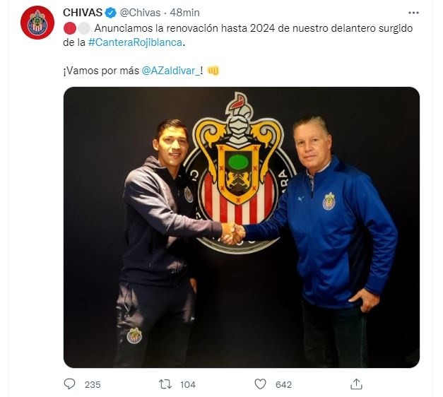 Con bombo y platillo y mediante sus redes sociales, el Guadalajara anunció que ha llegado a un acuerdo para renovar al delantero Ángel Zaldívar hasta 2024.El ariete, autor de tres goles en el Apertura 2021, pretende ser el goleador del Rebaño, por lo que ahora, con esta renovación, ya no tiene pretexto y su mente ya estará puesta al cien por ciento en la cancha.El "Ingeniero" Zaldívar vive su segunda etapa como rojiblanco, luego de que tuviera un paso por La Franja del Puebla y Rayados del Monterrey, antes de volver al Guadalajara a buscar ganarse un puesto como titular. El pleito interno por un lugar en la delantera del Guadalajara la llevan Zaldívar, Oribe Peralta, Alexis Vega, Ronaldo Cisneros y José de Jesús Godínez.Si quieres tener más contenido, más imágenes y aún más noticias, entonces descarga INFORMAPlus, la aplicación digital de EL INFORMADOR, donde tenemos materiales exclusivos para tí.Descarga la aplicación y pruébala GRATIS por treinta días. Para iOS: https://apple.co/35jaVgbPara Android: https://bit.ly/3gwVSEVSi eres suscriptor de EL INFORMADOR tu acceso está incluido, solicítalo al 33 3678-7777JL