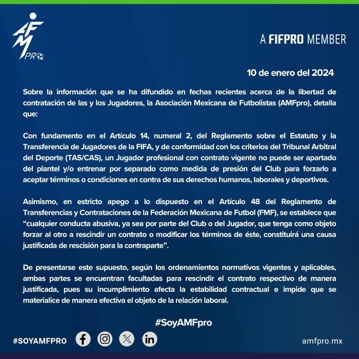 La novela entre Chivas y Alexis Vega parece no tener fin, pues este miércoles la Asociación Mexicana de Futbolistas (AMFpro) salió en defensa del jugador rojiblanco.Ante las versiones acerca de que el Rebaño podría congelar a Vega luego de que no aceptara las condiciones para irse vendido a Cruz Azul, la AMFpro lanzó un comunicado que si bien no menciona al Guadalajara o al futbolista, sí tiene tintes de advertencia."Un Jugador profesional con contrato vigente no puede ser apartado del plantel y/o entrenar por separado como medida de presión del Club para forzarlo a aceptar términos o condiciones en contra de sus derechos humanos, laborales y deportivos (...) cualquier conducta abusiva, ya sea por parte del Club o del Jugador, que tenga como objeto forzar al otro a rescindir un contrato o modificar los términos de éste, constituirá una causa justificada de rescisión para la contraparte", reza el comunicado de la Asociación.Luego de que no llegara a un acuerdo con Cruz Azul debido a que no quiso aceptar las cláusulas de conducta que buscaba imponer "La Máquina", Alexis dejó a Chivas sin la posibilidad de conseguir alguna suma de dinero por los servicios del futbolista, mismo que prefirió terminar su contrato con el Rebaño para luego irse al equipo de su preferencia sin costo alguno.Dicha situación no fue bien tomada en el Guadalajara, y ante la posibilidad de que la directiva tapatía lo congele durante los meses que le quedan de contrato, la Asociación piensa tomar cartas en el asunto.SV