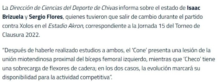 Luego de que salieran lesionados durante el juego entre Chivas y Xolos de Tijuana, Isaac Brizuela y Sergio Flores no tienen fecha para regresar a la actividad con el Club Deportivo Guadalajara.Fue este miércoles cuando el cuadro tapatío dio a conocer los diagnósticos médicos del “Cone” y la “Morsa.“Después de haberle realizado estudios a ambos, el ‘Cone’ presenta una lesión de la unión miotendinosa proximal del bíceps femoral izquierdo, mientras que ‘Checo’ tiene una sobrecarga de flexores de cadera; en los dos casos, la evolución marcará su disponibilidad para la actividad competitiva”, explicó el Rebaño en un comunicado.De esta manera Chivas acrecentó su lista de jugadores lesionado, pues además de Brizuela y Flores, Fernando Beltrán y José Juan Macías se han ausentado de los últimos partidos del cuadro rojiblanco debido a sus respectivas molestias.Con todo esto en contra, pero con el ánimo de haber conseguido un par de victorias en fila, los dirigidos por Ricardo Cadena se medirán contra Pumas el próximo sábado en la cancha del Estadio Akron.JL