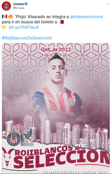 Ante la baja de Rodolfo Pizarro, Roberto el "Piojo" Alvarado, jugador de Chivas, se integrará a la Selección Mexicana para disputar los últimos duelos de la eliminatoria mundialista rumbo a Qatar 2022."Chivas tendrá un par de representantes en los próximos tres partidos de la eliminatoria mundialista. Primero fue Alexis Vega el que entró en la convocatoria de México para los compromisos contra Estados Unidos, Honduras y El Salvador, y ahora, después de anotar el gol del Rebaño Sagrado en el Clásico Tapatío, Roberto Alvarado fue considerado por el ‘Tata’ Martino para integrarse al representativo tricolor", escribió Chivas para anunciar la convocatoria del "Piojo".Será este jueves cuando México dispute el primero de estos tres juegos, y su rival será ni más ni menos que Estados Unidos dentro de la cancha del Estadio Azteca.Así como Alvarado, Carlos Acevedo también fue convocado por el "Tri" de manera inesperada, esto ante la baja de Jonathan Orozco.OF