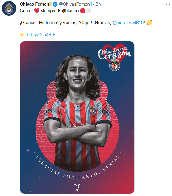 Este viernes, Chivas dio a conocer la salida del equipo de quien fuera un ícono y estandarte del equipo, Tania Morales.Por medio de un comunicado, el Rebaño se despidió de la jugadora que pasara 20 años en el club, pues Tania Morales se formó en Chivas Femenil Gigantera a donde llegó a los 14 años. Durante su estancia disputó la Liga Córdica en la que levantó cinco títulos, la Copa MX Femenil, y debutó con el equipo campeón en la Liga MX Femenil en el primer torneo celebrado en el Apertura 2017, y desde entonces portaba el gafete de capitana."No pudo ser alguien más que ella quien levantara el trofeo del campeonato del Apertura 2017 en el Estadio Akron, el primero en la historia de la Liga MX Femenil, la verdadera y única 'CapiTania' del Rebaño Sagrado", dice Chivas en su texto."Chivas ha sido parte de mi vida desde que era una adolescente y me he sentido como en mi casa, es mi familia y mi sangre, por eso mi entrega al equipo siempre fue total; aquí he vivido los mejores años de mi vida, he encontrado a las amistades más entrañables y por supuesto que pasé el mejor día de mi vida: la Final en el Estadio Akron, fue un sueño hecho realidad gracias al club", dijo la mediocampista para despedirse.Con Chivas, Tania Morales disputó 95 partidos, en los que anotó 19 goles y contribuyó con 15 asistencias.OF