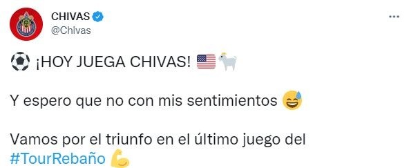 En Chivas prefieren ver las cosas con humor, y a pesar de que el equipo carece de resultados deportivos favorables, hoy el Rebaño decidió burlarse de su situación.De cara a que se midan al León en el PayPal Park de San José, California, el Guadalajara publicó un twit en su cuenta oficial que ha dividido opiniones entre la afición rojiblanca.“¡Hoy juega Chivas! Y espero que no con mis sentimientos”, se puede leer en el mensaje publicado por la cuenta oficial del Rebaño.Algunos internautas han tomado esto como una buena puntada del equipo ante su mal momento, pero otros más consideraron que el club se equivocó al realizar esta publicación.Entre partidos oficiales y amistosos, el Rebaño ya hiló tres juegos sin conseguir un triunfo, pues el cuadro que dirige Marcelo Michel Leaño no pudo imponerse ante América, Atlas y Pumas.JL