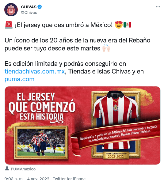 Aunque ya había trascendido en redes sociales desde hace algunos meses, fue hasta ahora que las Chivas presentaron de manera oficial su nueva camiseta conmemorativa.Se trata de un jersey rojiblanco que se lanzó para festejar los 20 años de la familia Vergara al mando del conjunto tapatío.Debido a esto la camiseta presenta un diseño clásico rojiblanco similar al que el equipo lució cuando el empresario Jorge Vergara tomó las riendas del Rebaño.En específico, este jersey está inspirado en el que Guadalajara utilizó en la Temporada 2003-2004, misma en la que lograron llegar a la Final contra los Pumas de la UNAM.Será hasta el próximo 8 de noviembre a partir de las 09:00 horas, tiempo del centro del país, cuando se ponga a la venta este jersey conmemorativo del Rebaño por los 20 años de la era Vergara.OF