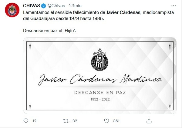 Este sábado, a la edad de 69 años, falleció el ex futbolista Javier Cárdenas, quien durante su carrera jugó para clubes como Chivas y Toluca.Este mediocampista estuvo en las filas de Chivas desde 1979 a 1985, y aunque nunca pudo coronarse con el Rebaño, sí fue campeón de México durante su etapa con los Diablos Rojos.El "Hijín", como era conocido popularmente, también tuvo una etapa con el América y con el Irapuato, pero es mayormente recordado por su faceta como capitán del Club Deportivo Guadalajara.Cárdenas fue un jugador especial que dentro de la cancha llamaba la atención por su juego y por su peculiar dorsal con el número uno, algo que por lo general está reservado para el portero.Posteriormente también jugó con el número ocho en la espalda, y aunque hizo historia para bien dentro del Rebaño, también tuvo momentos complicados como el haber formado parte del equipo rojiblanco que perdió la final con América en la Temporada 1983-1984.JM