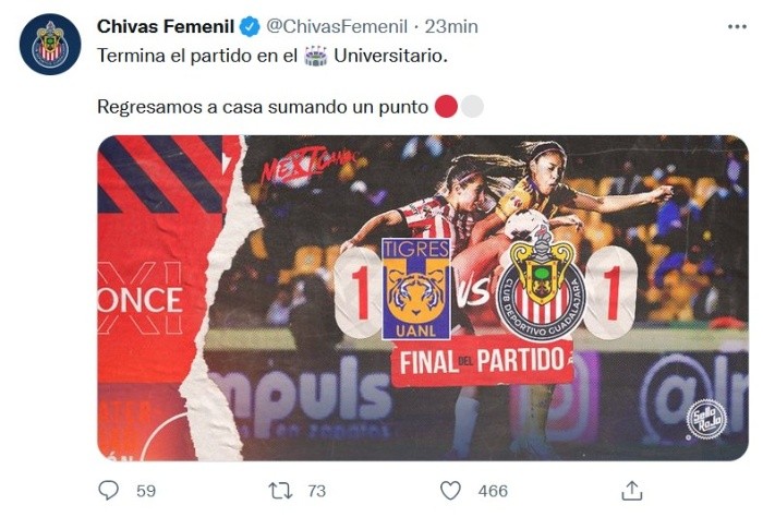 De nueva cuenta el Rebaño salió bien librado ante Tigres, pues esta noche el equipo femenil de Chivas sacó el empate en la cancha del Estadio Universitario.Luego de que la primera mitad terminara sin goles en el “Volcán”, Tigres abrió el marcador al minuto 51 por conducto de la africana Uchenna Kanu, quien marcó ante el Rebaño para estrenarse como goleadora en la Liga MX Femenil.Después de que las regias inauguraran el marcador, Chivas no tardó mucho en igualar los cartones, ya que al 62' Joseline Montoya venció las redes del cuadro local.Fue con un espectacular remate de palomita que Montoya pudo empatar el juego para las Chivas, y ese tanto les valió para que a la postre el Rebaño se llevara un punto de una de las plazas más complicadas del circuito.Con este empate Chivas llegó a cuatro puntos en el Clausura 2022, esto como resultado de la goliza a Pachuca en la primera jornada y el empate con las regias este lunes.JM