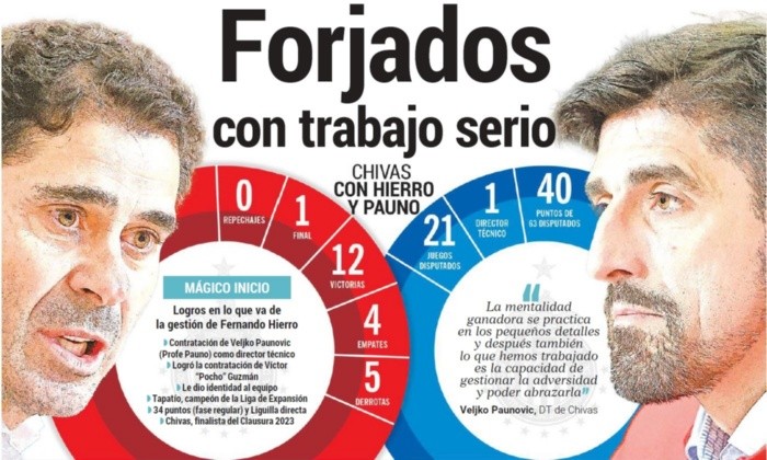 En medio de un mar de dudas y críticas, el Consejo Directivo del Club Deportivo Guadalajara dio, en el último trimestre del año pasado, un fuerte golpe sobre la mesa luego de la cascada de fracasos, los últimos derivados de las decisiones de Ricardo Peláez, entonces director deportivo. Es por ello que se tomó la determinación de contratar a Fernando Hierro, español con gran historial en el mundo del futbol, pero con poco conocimiento del balompié mexicano.En octubre de 2022, el exjugador del Real Madrid y de la Selección española fue presentado por Amaury Vergara como nuevo director deportivo de la institución. Hierro se encargaría de tomar las decisiones apegadas al primer equipo, desde la contratación de quien sería el director técnico en lugar de Ricardo Cadena, hasta la llegada de refuerzos y las salidas de jugadores.Pero una vez realizada su presentación, la polémica y las severas críticas aparecieron sobre el directivo ibérico, ya que dejó sus responsabilidades en Guadalajara. La planeación del equipo y las tareas pendientes quedaron a la espera, pues Hierro tuvo que viajar a la Copa del Mundo de Qatar 2022, ya que previamente le había confirmado a una cadena de televisión de su país su participación como analista.Sin embargo, a su regreso se puso a trabajar y pronto, en medio de más críticas, contrató a Veljko Paunovic, director técnico serbio que pocos o nadie conocían; además de que fue en la búsqueda de refuerzos, encontrando a Víctor Guzmán, quien era un objeto del deseo desde años atrás.En su primer día se comprometió a que su proyecto rendiría frutos en tres años. Cumplió y más pronto de lo esperado. Hoy tiene al Rebaño, junto con el profe Pauno, en la final del Clausura 2023 apenas en su primer torneo completo como equipo de trabajo.Para que Chivas esté donde hoy se encuentra, peleando por la gloria tras haber dejado en el camino a sus acérrimos rivales, Fernando Hierro tuvo que rodearse de gente de su confianza, que ha mostrado su capacidad y su arduo trabajo. Juan Carlos Martínez Castrejo y Fran Pérez Lázaro, así como Javier Mier en Fuerzas Básicas, colaboran para que el Guadalajara busque trascender.Mejores resultados que PeláezLas Chivas con Fernando Hierro se metieron a la final del futbol mexicano en tan sólo seis meses de gestión, periodo que arrancó con bajas expectativas (alimentadas por los resultados de torneos anteriores), con un entrenador de pocos reflectores y un solo refuerzo de peso.En la gestión anterior (la de Ricardo Peláez), Chivas acumuló más penas que glorias, pues no existía un proyecto serio, ya que el desfile de técnicos fue constante y las incorporaciones rindieron pocos o nulos frutos.Con Peláez al frente, pasaron entrenadores de renombre en el futbol mexicano como Luis Fernando Tena y Víctor Manuel Vucetich, y algunos improvisados como Marcelo Michel Leaño y Ricardo Cadena. Todos ellos poco o nada hicieron por consolidar a un equipo ganador.Desde noviembre de 2019, hasta septiembre de 2022, las Chivas de Peláez se metieron a liguilla dos veces por la vía del repechaje y fracasaron en esta instancia en tres ocasiones.LOGROS DEPORTIVOSLa última ocasión en la que el Guadalajara se clasificó directamente a la liguilla fue precisamente en el torneo de su más reciente título y, entre tantas casualidades que se han dado, en este Clausura 2023 terminaron terceros de la tabla general, igual que en aquel Clausura 2017.Con su trabajo y el de su cuerpo técnico, Pauno formó una línea de zagueros sólida, la cual se colocó entre las mejores cinco defensas del campeonato admitiendo 18 goles; además, y a pesar de no alinear a un centro delantero nominal durante gran parte del campeonato, todo el equipo se involucró en la generación ofensiva.De igual forma, el Rebaño del serbio logró su clasificación a la Concachampions, torneo que el Rebaño ganó en su más reciente participación, ocurrida en 2018.“Estamos alcanzando los objetivos que nos establecimos, como por ejemplo llegar a la Concachampions, que no se lograba desde hace mucho tiempo, y todo esto es debido a nuestra manera de progresar partido a partido (…); el torneo ha sido competitivo, muy exigente, la verdad es que me encantó todo el torneo hasta ahora. Obviamente estamos teniendo un avance, por lo tanto me da la oportunidad de seguir aprendiendo”, comentó el director técnico.DIRECTOR TÉCNICONadie lo conocía, no había persona que apostara por él más que Fernando Hierro, quien lo trajo. En el radar del futbol mexicano no se encontraba y llegaba a un ambiente que ni él conocía; así fue el arribo del profe Pauno al Club Deportivo Guadalajara, entre especulaciones, dudas, cuestionamientos, pero sobre todo, entre un mar de esperanza por parte de los aficionados de Chivas que buscaban una mano salvadora para que alguien sacara al equipo de las crisis en la que se encontraba. En su palmarés cuenta con un único título que fue obtenido con la Selección Serbia Sub-20 en el Mundial de Nueva Zelanda 2015; pero este logro tiene mayor peso cuando se sabe que el conjunto de las Águilas Blancas tenía 28 años sin poder conseguir un campeonato y que se lo arrebataron a Brasil.Ahora ha logrado que Chivas resurja de las cenizas, consiguiendo un torneo histórico en el que instaló al Guadalajara nuevamente a una final después de seis largos años de espera, pero más allá de eso, ha construido un conjunto competitivo, a pesar de tener muchas limitaciones. Además, tuvieron que pasar 19 años para que se cosecharan 34 unidades y marcar uno de los mejores torneos cortos para el club.Sin embargo, no ha sido por arte de magia que el Rebaño se haya levantado, pues el principal factor, como él lo ha hecho saber y sus jugadores también, es el cambio de mentalidad que le ha integrado al Guadalajara.“La mentalidad ganadora se practica en los pequeños detalles y después también lo que hemos trabajado es la capacidad d