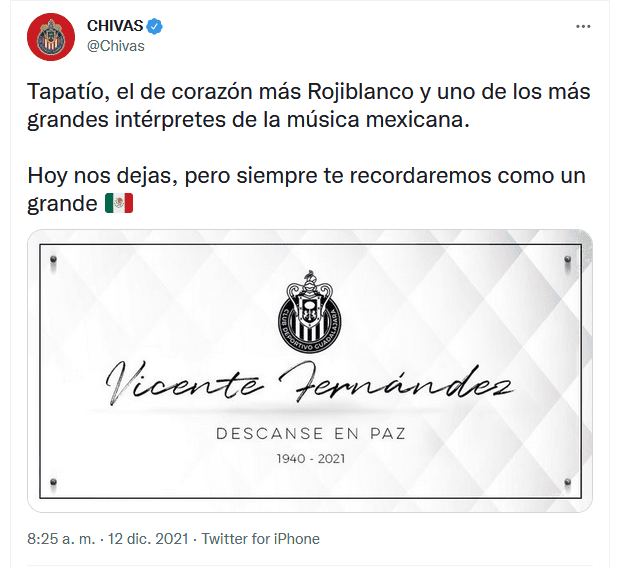 Este domingo 12 de diciembre de 2021 murió el legendario cantante mexicano Vicente Fernández a los 81 años de edad. Su familia confirmó el deceso a través de sus redes sociales oficiales, las cuales también aprovechó el equipo de Chivas para enviarle un sentido mensaje a quien fuera uno de sus aficionados más destacados."Tapatío, el de corazón más Rojiblanco y uno de los más grandes intérpretes de la música mexicana. Hoy nos dejas, pero siempre te recordaremos como un grande", escribió Chivas en su cuenta de Twitter.Vicente Fernández falleció a las 06:15 horas de este domingo, tras cuatro meses hospitalizado. La familia había informado ayer que se encontraba en "estado crítico" de salud, y "con pronóstico" muy reservado.Hasta el momento, no se ha dado información sobre lo que sucederá tras la muerte de Vicente Fernández, ni detalles sobre funeral o algún homenaje que se planee realizar.OF