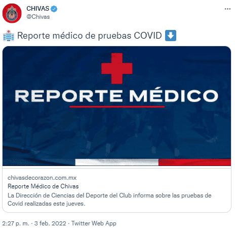Chivas sigue padeciendo por el tema del COVID 19, pues a pesar de que ayer no se detectó ningún caso en el plantel luego de que se aplicaran las pruebas de rutina, este jueves el Rebaño informó que uno de sus jugadores presentó síntomas del coronavirus y a la postre se le diagnosticó positivo."La Dirección de Ciencias del Deporte de Chivas informa que este miércoles se realizaron pruebas de control para la detección de COVID en el plantel del Guadalajara, previo a su compromiso de la Jornada 4 ante Bravos de Juárez, y todas las pruebas resultaron negativas"."Sin embargo, este jueves, uno de nuestros jugadores presentó síntomas, se le aplicó otra prueba y resultó positivo. Tras conocer el resultado, la persona en cuestión fue aislada de inmediato y ya se encuentra con el debido seguimiento médico conforme al protocolo de salud establecido por Chivas y la Liga MX", explicó Chivas en un comunicado. La semana pasada el Rebaño tuvo que separar del plantel a Jesús Angulo, Cristian Calderón y César huerta, y ahora los rojiblancos tienen un nuevo caso positivo a un par de días de medirse a los Bravos de Juárez.OF