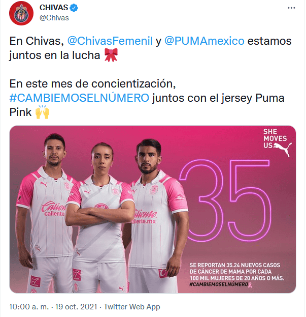 Como se ha vuelto costumbre cuando llega el mes de octubre, Chivas reveló su nuevo uniforme rosa en pro de la concientización en la lucha contra el cáncer de mama.En esta ocasión, Chivas y la marca deportiva que los viste lanzaron un jersey en donde predomina el color blanco, pero los vivos y las mangas son en color rosa para unirse a esta causa.En lo que respecta al pantaloncillo el caso es el mismo, pues domina el color blanco y el rosa aparece en los patrocinadores y detalles.Sería este miércoles cuando Chivas estrene este nuevo uniforme, pues en esta fecha el Guadalajara visitará el Estadio Caliente para medirse a los Xolos a las 21:06 horas. OF