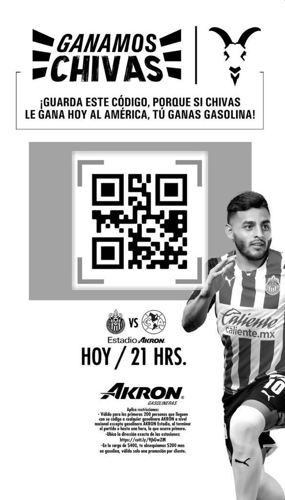 Que las Chivas le ganen al América siempre es sinónimo de felicidad para la ciudad de Guadalajara, pero que lo hagan y que además haya gasolina gratis por eso, lo hace todavía más atractivo. Esto es posible gracias a que las gasolineras Akron anunciaron una promoción en la que los consumidores podrán obtener gasolina gratis si el equipo dirigido por Marcelo Michel Leaño se lleva la victoria en el Clásico Nacional ante las Águilas del América. La promoción consiste en que si las Chivas derrotan al América, los primeros 200 clientes en acudir a cualquier gasolinera Akron obtendrán 200 pesos de gasolina gratis en la carga de $400. Únicamente se hará válida una promoción por cliente y para hacerlo efectivo deberás presentar el código QR que posteó Chivas en sus redes sociales. Así que ya lo sabes, si las Chivas ganan, podrás acceder a gasolina gratis en Akron Gasolineras. JL
