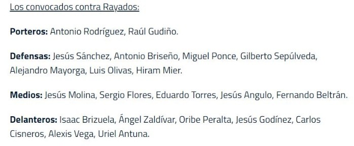 La crisis de resultados pone a Víctor Manuel Vucetich en riesgo de dejar el banquillo rojiblanco en caso de caer el sábado ante Monterrey.Chivas anunció la lista de jugadores convocados para el duelo ante Rayados y destaca la ausencia de Cristian "El Chicote" Calderón.El club no explicó la ausencia de Calderón, pero podría ser una probable sanción por su comportamiento con los aficionados en el partido de la Jornada 5 ante León, ya que al final del encuentro discutió con el público.Otro jugador que no hizo el viaje a Monterrey fue César Huerta, ya que estuvo en contacto con una persona que dio positivo a Covid-19.Chivas detalló que "El Chino" Huerta no presenta síntomas y ya se le realizó una prueba de antígenos, misma que dio resultado negativo. Si quieres tener más contenido, más imágenes y aún más noticias, entonces descarga INFORMAPlus, la aplicación digital de EL INFORMADOR, donde tenemos materiales exclusivos para tí.Descarga la aplicación y pruébala GRATIS por treinta días. Para iOS: https://apple.co/35jaVgbPara Android: https://bit.ly/3gwVSEVSi eres suscriptor de EL INFORMADOR tu acceso está incluido, solicítalo al 33 3678-7777JL