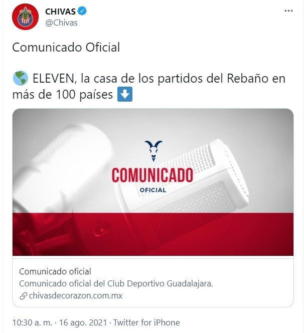 Chivas sigue innovando en el tema de transmisiones, pues este lunes el equipo rojiblanco anunció a Eleven como la nueva plataforma en donde más de 100 países podrán ver los juegos de Chivas y Chivas Femenil.En un comunicado difundido por el club, Chivas explica que a través de esta plataforma (ElevenSports.Com), la afición del Rebaño podrá observar todos los partidos que Chivas y Chivas femenil disputen como locales en el Apertura 2021, ''esto en vivo y 'on-demand', de forma gratuita''.Además, en esta plataforma también se transmitirán algunos partidos de las categorías juveniles, sujetos a disponibilidad y transmisión.Entre las principales virtudes de esta plataforma, el Guadalajara destacó la facilidad que tendrán los aficionados para seguir al Rebaño, pues las transmisiones podrán sintonizarse a través de la web, el teléfono celular, la tablet y la televisión.Al respecto de esta alianza, Olimpia Cabral, directora de Marketing y Comunicación de Chivas, destacó que este vínculo contribuirá a que nuestra Liga sea consumida en otras latitudes del planeta.''Chivas sigue siendo pionero en México ayudando a internacionalizar nuestra Liga y no hay mejor manera de hacerlo que trabajando con una empresa como Eleven Group, líder en la industria del contenido deportivo'', finalizó. ¿Quieres saber más?Si quieres tener más contenido, más imágenes y aún más noticias, entonces descarga INFORMAPlus, la aplicación digital de EL INFORMADOR, donde tenemos materiales exclusivos para ti.Descarga la aplicación y pruébala GRATIS por treinta días. Si eres suscriptor de EL INFORMADOR tu acceso está incluido, solicítalo al 33 3678-7777OF
