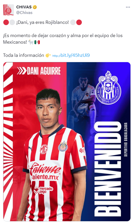 Las Chivas iniciaron esta semana con una nueva contratación, y se trata de Dani Aguirre, futbolista que llegó al Rebaño procedente de la Major League Soccer (MLS) de los Estados Unidos.En específico, Aguirre se vestirá de rojiblanco después de haber militado en el Galaxy de Los Ángeles, club en donde coincidió con Javier "Chicharito" Hernández."El Guadalajara continúa enfocado en darle herramientas suficientes a Fernando Gago para alcanzar el máximo potencial del equipo, por lo que hay una nueva incorporación de cara al Apertura 2024"."Estamos hablando de Daniel Aguirre, quien se suma al Rebaño Sagrado para ampliar la baraja de mediocampistas que existen en el equipo", explicó el Rebaño en el comunicado oficial tras el anuncio de este futbolista.Aunque apenas lo hicieron oficial, este mediocampista junto con Bruces El-Mesmari ya se había integrado a la pretemporada del equipo tapatío.*Mantente al día con las noticias, únete a nuestro canal de WhatsAppOF