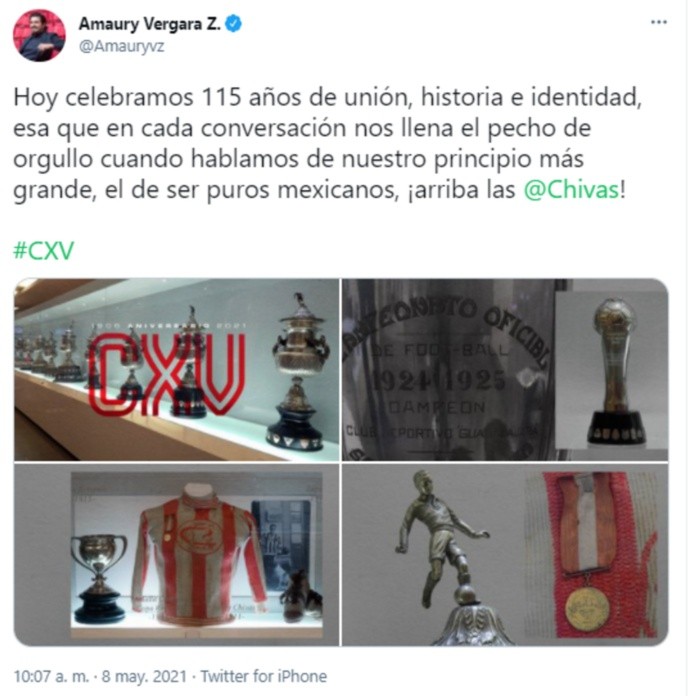 De todos lados le llovieron las felicitaciones a Chivas, iniciando con todos los clubes de la Liga MX, así como ex jugadores que marcaron diferencia y los que no tanto. La afición aprovechó para inundar las redes sociales mostrando su amor por la institución subiendo fotos con su playera rojiblanca.El presidente Amaury Vergara en sus cuentas oficiales en redes sociales, le mandó un mensaje a toda la nación rojiblanca: ''Hoy celebramos 115 años de unión, historia e identidad, esa que en cada conversación nos llena el pecho de orgullo cuando hablamos de nuestro principio más grande, el de ser puros mexicanos, ¡arriba las @Chivas!''.Todos los jugadores del primer equipo también se manifestaron, entre ellos Jesús Sánchez, quien puso esto en sus redes: ''115 años de historia y tradición, felicidades @Chivas gracias por formarme como futbolista pero sobretodo como persona, eres y seguirás siendo el más GRANDE por lo que representas y lo que generas en más de 40 millones de personas''.Ex jugadores rojiblancos que fueron capitanes del ''Rebaño'' también se manifestaron, todos pusieron mensajes y su sentir por los colores rojiblancos, entre ellos los ex capitanes Ramón Morales, Joel Sánchez y Carlos Salcido.El ''Tiburón'' recordó con mucho cariño a quienes pusieron los cimientos de la grandeza rojiblanca, los campeonísimos: ''Calderón, Chaires, Sepúlveda, Villegas, Jasso, Valdivia, Ponce, Díaz, Hernández, Reyes, Jara y muchas figuras más, mi reconocimiento y gratitud para ustedes por este gran legado, nos dejaron demasiado cariño de toda la familia @Chivas felices 115 años de historia y grandeza''.Osvaldo Sánchez, ex capitán rojiblanco también se manifestó, aunque algunos aficionados no tomaron a bien su comentario y le seguían reclamando el haberse ido de la institución por dinero, un tema añejo que utilizan algunos solamente para molestar.''¡Muchas felicidades a mis @Chivas! 115 años de historia para el club más importante de México. Siempre agradeceré el haber sido parte de su historia, los llevo en el corazón''.La Federación Mexicana de Futbol también emitió una felicitación para el club Guadalajara por su aniversario, así como otros equipos internacionales, principalmente donde jugaron elementos nacidos en la cantera rojiblanca, como el Bayer Leverkusen.Conoce más de la historia del Rebaño Sagrado. Disfruta del suplemento especial "Chivas 115 años" que encontrarás exclusivamente en InformaPlus. Ingresa a este link, descarga la aplicación y disfruta de 10 días de prueba gratis.OF