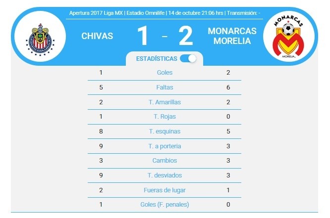 A pesar de dar un buen partido, Chivas cayó 2-1 ante Monarcas Morelia, que ganó gracias a un autogol de Carlos Salcido en tiempo de compensación. Salcido también anotó el único gol del Rebaño al minuto 61.Chivas terminó jugando con diez hombres el partido de la jornada 13 por la expulsión de Rodolfo Pizarro al minuto 80.Respecto a su último partido, en que cayeron ante Tigres el pasado 30 de septiembre, los rojiblancos sólo hicieron una modificación en su once inicial, con Orbelín Pineda en el medio campo en lugar de Michael Pérez.El Rebaño tuvo opciones de gol en el primer tiempo, pero no logró concretar. Morelia fue cauto, plantándose con seguridad en la defensa, intentando sorprender a la defensa local en el contraataque.Una de las mejores acciones de la primera mitad la regaló Rodolfo Pizarro, que remató de chilena un centro de Carlos Cisneros. El disparo del tamaulipeco abandonó la cancha de manera dramática, volando a pocos centímetros de la escuadra de la portería de Monarcas.Relacionada: Minuto a Minuto: Chivas 1-2 MoreliaAunque el Rebaño no ofreció un mal partido, fue la visita quien recibió la recompensa al minuto 49, cuando Rodolfo Cota cometió una falta en el área rojiblanca. El árbitro Ortiz Nava decretó el penalti, que Ruidiaz convirtió para poner el 1-0 momentáneo.Matías Almeyda no tuvo contemplaciones: sacó a sus dos defensas laterales, Hernández y Sánchez, y mandó al campo a Brizuela y Fierro.El Rebaño respondió con el amor propio del campeón defensor y empató el marcador con un remate rabioso de Carlos Salcido en jugada de tiro de esquina por derecha al minuto 61.Como en el primer tiempo, en la segunda parte Pizarro tuvo una ocasión que hizo que los aficionados rojiblancos se alzaran de sus asientos, pero el jugador no logró reivindicarse: dejó al Rebaño con diez hombres al lanzar un manotazo que le constó la tarjeta roja al 80. El tamaulipeco no jugará el Clásico contra América.Chivas tuvo una reacción bravía y a pesar de jugar con un hombre menos creó al menos tres ocasiones de gol en los últimos minutos del partido, pero Sosa y la falta de precisión le negaron el gol de la victoria.En una desafortunada jugada, Carlos Salcido anotó al 93' un gol en propia puerta que hace que los Monaras se lleven los tres puntos del estadio rojiblanco.Chivas buscará una victora crucial para su estado anímico el próximo 18 de octubre, cuando visitará a las Águilas del América, su histórico rival.Alineaciones CHIVAS: Cota, Alanís, Hernández (Brizuela, 58'), Sánchez (Fierro, 58'), Pineda (Zaldívar, 51'), Pulido, Pizarro, Cisneros, Salcido, Vázquez, López. DT: Matías Almeyda (ARG)MORELIA: Sosa, Rodríguez (Millar, 88'), Guzmán, Vegas, Valadez, Millar, Ruidiaz, Sepúlveda (75', Cuero), Lezcano (Vilchis, 63'), Osuna, Valdés. DT: Roberto Hernández (MEX)ÁRBITRO: Marco Antonio Ortiz Nava
