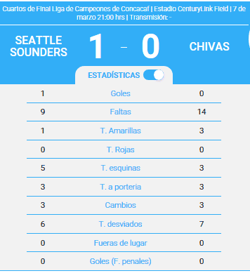 Chivas perdió por 1-0 ante los Sounders de Seattle el duelo de ida de los cuartos de final de la Liga de Campeones de Concacaf.El único gol del partido fue anotado por Clint Dempsey al 77'.A diferencia del primer partido contra el Cibao, en el que usó sus mejores piezas, para la ida contra los Sounders Chivas prescindió de Pizarro, el jugador rojiblanco que tiene mayor imaginación y dicta los tiempos en la cancha.Carlos Cisneros, un jugador ofensivo por naturaleza, apareció como defensa lateral derecho, una modificación que se vuelve cada vez más usual en el Rebaño de Almeyda.Ambos equipos tuvieron oportunidades de gol en la primera parte, con los locales obligando a Chivas en más de una ocasión a cortar jugadas en su propia área.A pesar de la insistencia de los locales, los rojiblancos tuvieron las posibilidades de anotación más claras de la primera parte. Al minuto 10 Godínez estiró la pierna y logró puntear un balón que parecía un gol inminente, pero una buena reacción del portero Frei evitó la caída de la meta de los Sounders.Al 32' Torres resbaló, dejando solo a Pulido, que se enfiló con la pelota controlada hacia la meta de los Sounders. El tamaulipeco intentó definir por encima del guardameta, pero terminó estrellando la pelota en el cuerpo de Frei.Al inicio del segundo tiempo los Sounders asfixiaron a Chivas, e incluso el árbitro Escobar Toca no marcó un penalti a favor de los locales cometido por Cisneros.La superioridad de los Sounders obligó a Matías Almeyda a mandar a Pizarro al campo en lugar de Brizuela al 55'. La entrada del ex Tuzo y de Sandoval por López ayudó a equilibrar el trámite del partido, pero no lo suficiente para permitir que Chivas anotaran.Después de un par de ocasiones desperdiciadas por Dempsey y McCrary, el primero anotó el único gol del partido al 77' tras un centro de Wingo, que entró como cambio en la segunda parte.El ganador de la serie entre Sounders y Chivas se medirá al vencedor del duelo entre los Red Bulls de Nueva York y los Xolos de Tijuana, que cayeron ayer por 2-0 ante los estadounidenses.Chivas recibirá a los Sounders el próximo miércoles 14 de marzo a las 21:00 horas, pero antes visitará a los Lobos BUAP el sábado 10 de marzo en partido de la jornada 11 de la Liga MX.ALINEACIONESSEATTLE SOUNDERS: Frei; Francis, Marshall, Torres, McCrary; Bwana (Wingo, 71'), Roldán, Svensson, Lodeiro; Dempsey (Shipp, 89'), Bruin (Neagle, 79').CHIVAS: Cota; Mayorga, Alanís, Salcido, C. Cisneros; Brizuela (Pizarro, 55'), Pineda, Pérez (Macías, 80'), López (Sandoval, 66'); Godínez, Pulido.ÁRBITRO: Mario Escobar Toca (GUA)LS