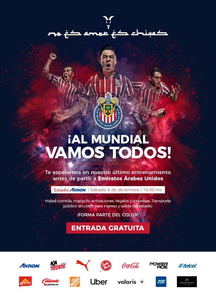 A través de sus redes sociales, Chivas convocó a sus aficionados a apoyar al equipo en el último entrenamiento que tendrán en Guadalajara antes de partir a los Emiratos Árabes Unidos para disputar el Mundial de Clubes.La sesión tendrá lugar en el estadio Akron el próximo sábado 8 de diciembre a las 16:00 horas, y la entrada será gratuita.De acuerdo a la invitación publicada por el club, "habrá mariachi, activaciones, regalos y sorpresas", así como "transporte público sin costo para ingreso y salida del estadio".Chivas asistirá a la competicion como campeón de la Confederación de Norteamérica, Centroamérica y el Caribe de Futbol (Concacaf), y se enfrentará al club japonés Kashima Antlers el próximo sábado 15 de diciembre a las 07:00 horas, tiempo del centro de México. RR