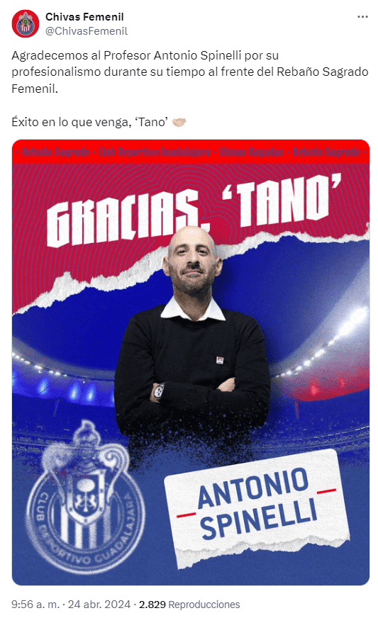 Llegó la hora. Después de tantas irregularidades en este Clausura 2024 en el que Chivas Femenil acumula cuatro partidos consecutivos sin ganar, el estratega argentino Antonio Spinelli ha sido destituido de su cargo.La mañana de este miércoles, el club rojiblanco emitió un comunicado a través de redes sociales en el que informaron que el "Tano" dejaba la dirección técnica, y a su vez, le agradecían a él, y a su auxiliar Gastón Camargo, su dedicación y compromiso durante casi un año en el puesto."El Club Deportivo Guadalajara informa que Antonio Spinelli deja la Dirección Técnica de Chivas Femenil a partir de este momento. Agradecemos la dedicación y el compromiso que él y Gastón Camargo, su auxiliar, mostraron al frente del equipo", se pudo leer.Asimismo, también comunicaron que Joaquín Moreno Ruíz, quien era parte del actual cuerpo técnico de las Chivas Sub 18 varonil, será quien se ocupe de dirigir de forma interina a las rojiblancas por lo que queda de la campaña."Hacemos de su conocimiento que Joaquín Moreno Ruíz, un entrenador con una larga trayectoria y palmarés en múltiples categorías del Rebaño Sagrado, identificado plenamente con nuestra institución y quien ha sido parte del actual cuerpo técnico del cuadro Sub 18 varonil, asumirá de manera interina como estratega de Chivas Femenil por lo que resta del Torneo de Clausura 2024", indicaron.El siguiente compromiso del Rebaño será este domingo 28 de abril a las 17:00 horas en el Estadio AKRON cuando se midan ante el Cruz Azul en el partido correspondiente de la jornada 16, en el que buscarán amarrar su clasificación a la liguilla y volver a la senda de la victoria.*Mantente al día con las noticias, únete a nuestro canal de WhatsAppOF