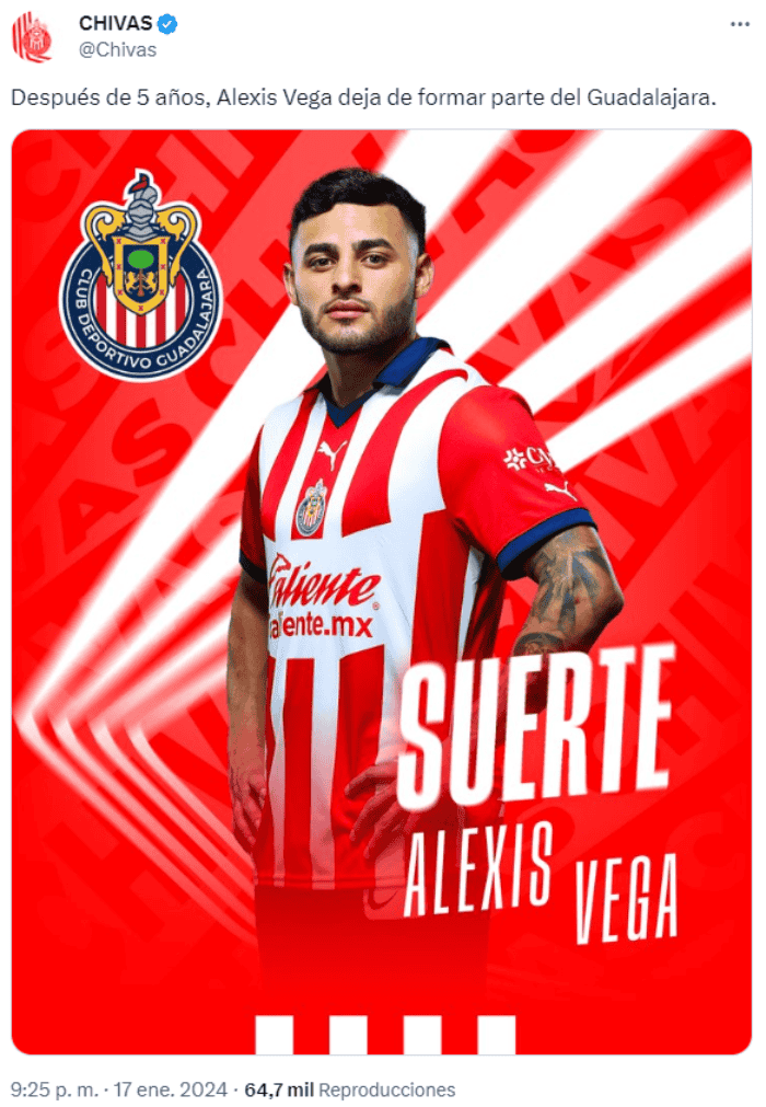 Las Chivas se han desprendido oficialmente de Alexis Vega, delantero que a partir de ahora pasará a formar parte de las filas del Toluca.Fue con un breve mensaje que el Rebaño anunció la salida del atacante, el cual durante los últimos meses vivió en medio de polémicas e indisciplinas que lo llevaron a desgastar su relación con el equipo y sus aficionados."Después de 5 años, Alexis Vega deja de formar parte del Guadalajara", fue todo lo que escribió Chivas para despedir al jugador. Alexis pasó del amor al odio en su estadía por Chivas, ya que en algún momento fue uno de los elementos más queridos por parte de la afición para después ser abucheado cada que ingresaba al terreno de juego.Fue para el Clausura 2019 cuando Alexis se vistió con la camiseta rojiblanca, y desde ese entonces su mayor aporte goleador en un torneo fueron cinco goles en el 2022. SV