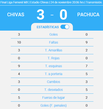 Las jugadoras de Chivas se convirtieron en las primeras campeonas de la Liga femenil MX al imponerse en el global por marcador 3-2 a las Tuzas del Pachuca.Las hidalguenses se habían impuesto 2-0 a las tapatías en el partido de ida, jugado el pasado lunes 20 de noviembre, en el que las Tuzas dominaron las acciones.A diferencia del primer partido, Chivas tuvo mayor presencia en el mediocampo y su capitana Tania Morales tuvo un papel más activo a la ofensiva.El juego se disputó con una aspereza inusual para la Liga femenil. Al final del primer tiempo se habían mostrado tres tarjetas amarillas, dos para jugadoras de Chivas y una para las Tuzas. Pachuca recurrió a las faltas para frenar al Rebaño en la mitad del campo. La estrategia por poco les cuesta un gol en contra cuando al minuto 17 las rojiblancas sacaron un obús en un cobro de tiro libre que obligó a la portera hidalguense a volar para mandar el balón a tiro de esquina.Aunque las rojiblancas no siempre fueron claras en el último tercio de la cancha, buscaron el gol con mayor insistencia y obtuvieron su recompensa al minuto 37, cuando Arlett Tovar anotó de cabeza en un tiro de esquina por izquierda cobrado por Tania Morales.Al minuto 55, Chivas repitió la dosis: cobro de tiro de esquina de Tania Morales y cabezazo de Tovar, que puso el 2-0 en el partido de vuelta y el empate en el marcador global.Tras recibir un gran pase filtrado, Norma Palafox definió con frialdad ante la guardameta Tuza Alejandría Godínez para poner el 3-2 en el global a favor del Rebaño al 68'. Así, Chivas enriquece su ya robusta historia convirtiéndose en el primer equipo campeón de la Liga femenil. ALINEACIONESChivas: Félix, Sánchez, García, Padilla, Viramontes (Arce, 90'), Palafox (Carrandi, 85'), Benites (Vázquez, 53'), Tovar, Bejarano, Morales (C). DT: Luis MárquezPachuca: Godínez, Melgoza (González, 86'), Cárdenas, Nieto, García, Arellano, Gómez, De la Rosa (Salazar, 63'), Ángeles, Ocampo, Muñoz (Madrid, 82'). DT: Eva EspejoÁrbitro: Quetzalli Alvarado Godínez LS/ RR