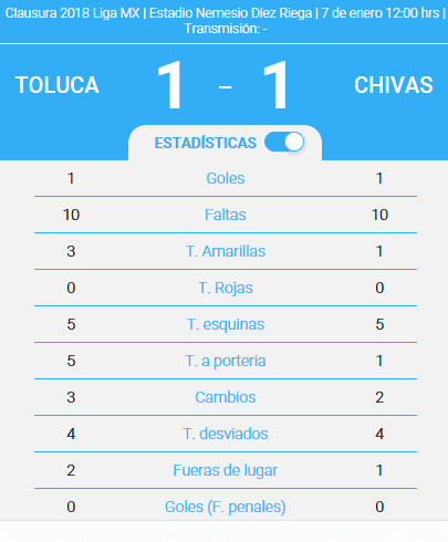 En su debut en el torneo Clausura 2018, el Guadalajara sumó la primera unidad en la Liga MX, luego de empatar 1-1 en su visita al Toluca. La anotación del equipo choricero fue obra de Alexis Vega (22'), mientras que Eduardo López hizo lo propio para los tapatíos (51').Chivas no pudo mandar desde el inicio a Jair Pereira por problemas de pubalgia ni a Carlos Salcido, quien abandonó la concentración la noche previa al encuentro, debido a un problema personal, así que los titulares en la defensa central fueron Hedgardo Marín y Miguel Basulto.Los rojiblancos se pararon así: Edwin Hernández lateral por izquierda y Jesús Sánchez por lado contrario. En la central Marín y “Abuelo” Basulto, delante de ellos Michael Pérez. Unos metros adelante del “Tortas” estaba Orbelín; como volantes extremos, por la derecha Eduardo López y banda contraria Carlos Cisneros. En punta Alan Pulido y atrás de él, Rodolfo Pizarro.Al minuto 11, Toluca estuvo cerca de abrir el marcador cuando tras un disparo de Leonel López de media distancia, el balón se estrelló en el travesaño, el esférico le quedó a Uribe, quien de media tijera intentó anotar, pero de nueva cuenta el travesaño salvó a los tapatíosA los dos minutos respondió Chivas, cuando Pizarro entró por la banda izquierda, habilitó entrando al área a “Chofis” López, quien conectó de primera intención con la presión de un rival encima y terminó echando el balón ligeramente desviado del arco.Cuando corría el 15', Pizarro junto a Pulido se pusieron mano a mano con los centrales González y Santiago García. Pizarro vio adelantado al arquero Luis García, así que desde media distancia intentó sorprender, pero su envío salió apenas por encima del travesaño.El encuentro estaba abierto.Toluca tocó el arco contrario de nueva cuenta, cuando Leonel entró por la izquierda y ante la salida de Rodolfo Cota, terminó enviando el esférico apenas desviado del poste derecho rojiblanco.Alexis Vega abrió el marcador con una tijera, tras una excelente jugada de Uribe, quien prolongó vía aérea el esférico y sin dejarlo caer, el “9” que se había agregado al ataque, estaba poniendo adelante al Diablo con el vistoso recurso. Cota se quedó parado y nada pudo hacer al 24’.En la penúltima jugada del primer tiempo, Marín estuvo cerca de empatar el tanteador, luego de que “Chofis” cobró un tiro libre que peinó el central, pero el arquero García desvió a tiro de esquina.En el arranque del segundo tiempo “Pitu” Barrientos recibió balón dentro del área, con el arco de frente y Cota cargado a la derecha, terminó el toluqueño por pegarle al esférico muy cargado a la izquierda y se esfumó una excelente opción de gol.EL Guadalajara reaccionó para igualar el marcador 1-1. “Chofis” López recibió dentro del área, se quitó a dos elementos con habilidad, luego se puso frente al arquero García, a quien le tocó el balón suave para vencerlo, al 52’. La defensa de Toluca reclamó mano en la jugada de “Chofis”, al momento de bajar el esférico.Almeyda buscando un mejor control en mediocampo, debutó con su equipo a Walter Gael Sandoval en lugar de Pineda, quien poco pudo hacer en el tiempo que estuvo en el campo, fue voluntarioso pero poco efectivo.Toluqueños y tapatíos se enfrascaron en la disputa por la posesión de balón, pero ninguno pudo establecer condiciones y el encuentro se tornó de difícil tránsito, con pocas opciones en los arcos. Firmaron el empate.ALINEACIONESToluca: 22. Luis García, 29. Rodrigo Salinas, 5. Osvaldo González, 3. Santiago García, 13. Aldo Benítez (84’, 23. Luis Quiñones); 9. Alexis Vega, 17. Leonel López (75’, 35. Juan Delgadillo), 15. Antonio Ríos, 14. Rubens Sambueza; 24. Pablo Barrientos, 20. Fernando Uribe (59’, 25. Pedro Canelo). D.T. Hernan CristanteGuadalajara: 30. Rodolfo Cota; 17. Jesús Sánchez, 28. Miguel Basulto, 5. Hedgardo Marín, 6. Edwin Hernández; 24. Carlos Cisneros (90’, 292. José Macías), 25. Michael Pérez, 7. Orbelín Pineda (65’, 13. Gael Sandoval), 10. Eduardo López; 20. Rodolfo Pizarro, 9. Alan Pulido. D.T. Matías Almeyda.RR