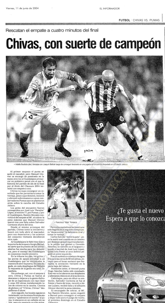 Fueron varios los títulos que Chivas ganó como local en el Estadio Jalisco y también varios los que perdió. Sin embargo, el que dejó ir ante Pumas en el muy recordado Clausura 2004, no se definió sino hasta la vuelta en Ciudad Universitaria. A aquella final el Guadalajara y los de la UNAM llegaron con la misión de no dar un balón por perdido, pues lograron un agónico empate de 1-1 en la ida en la que entonces era la casa del Rebaño."Con un dominio abrumador, pero con poca claridad a la hora de definir, Chivas no tuvo la suficiente contundencia para tomar una importante ventaja en cancha propia, tras empatar anoche a un gol con Pumas, en el partido de ida de la final por el título del torneo Clausura 2004, celebrado en el Estadio Jalisco ante unas 60 mil personas", dice la crónica del juego publicada el 11 de junio de aquel año de EL INFORMADOR."Pumas, con un planteamiento discreto, incluso hasta modesto en el ataque, tomó ventaja al aprovechar, en su primera llegada del segundo tiempo, un error del defensa Carlos Salcido, quien en su afán por despejar, globeó el balón al arquero Oswaldo Sánchez, se estrelló en el travesaño y quedó a merced de José Luis 'Parejita' López, quien sólo tuvo que empujar pegado al poste derecho para el 1-0 al minuto 77".Los aficionados de Chivas aquella tarde se quedaron callados ante el que era el final del primer capítulo, ya que parecía que la suerte no los acompañaba y sus atacantes no lograban encontrar la manera de que alguno de sus tiros a puerta perforara la portería de Sergio Bernal.Sin embargo, "El conjunto tapatío no bajó los brazos y a cuatro minutos del final encontró, por conducto de Ramón Morales, el gol del empate a través de una pena máxima" que el árbitro Manuel Glower marcó tras una falta en el área del ahora entrenador de la Selección Mexicana, Jaime Lozano, sobre Salvador Carmona."Con la igualada, si bien no hay ventaja para nadie, indudablemente favorece a los capitalinos que ahora tendrán la definición en su cancha" el domingo 13 de junio al mediodía.La suerte siguió con Pumas aquella vez.ChivasPumasPumas volverá a visitar a Chivas. En esta ocasión se medirán en la ida de los Cuartos de Final del Apertura 2023, una serie que el Guadalajara quiere superar para volver a jugar la final, y sacarse la espina luego de haber caído apenas en la disputa por el título del pasado Clausura 2023, esa vez ante Tigres.*Mantente al día con las noticias, únete a nuestro canal de WhatsAppOF