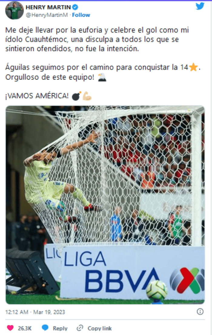 "Me deje llevar por la euforia y celebre el gol como mi ídolo Cuauhtémoc, una disculpa a todos los que se sintieron ofendidos, no fue la intención. Águilas seguimos por el camino para conquistar la 14. Orgulloso de este equipo! ¡VAMOS AMÉRICA! (sic)", escribió el también seleccionado nacional.