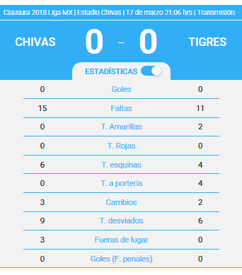 Chivas y Tigres igualaron 0-0 en partido de la jornada 12 del torneo Clausura 2018 disputado en el estadio Akron, casa de los rojiblancos.Los equipos ofrecieron un partido intenso, en el que no escasearon las llegadas claras a la meta rival.Aunque no es el resultado que esperaban, el empate permite que Chivas siga aferrándose a sus lejanas posibilidades de Liguilla, con 12 puntos tras 12 jornadas, a cinco unidades del octavo lugar.Chivas repitió la alineación que derrotó por 3-0 a los Sounders de Seattle en cuartos de final de Concacahampions el pasado miércoles.Tigres también repitió el once que inició ante Toronto en el torneo de Concacaf, con la excepción de Gingnac, que no tuvo acción por una lesión en la rodilla. Chivas, por su parte, no pudo contar con Alan Pulido a causa de un esguince en el tobillo derecho.Los dos equipos se demostraron respeto, sin presionar agresivamente la salida del rival por temor de descubrirse a la defensiva. A pesar de la prudencia, ambos bandos tuvieron ocasiones de gol. La más clara de Tigres llegó al 21', cuando Valencia disparó a puerta y Pereira desvió de "inglesita" el balón, que llevaba dirección de gol.Chivas cerró el primer tiempo mostrando su mejor futbol. Al 42' Brizuela hizo que pareciera que Torres Nilo jugaba en cámara lenta con un desborde que Godínez remató de cabeza, pero sin dirección.El segundo tiempo fue de Tigres, a pesar de la salida de Aquino por lesión al 56'.Los felinos tuvieron cinco ocasiones claras de gol, que no lograron concretar por falta de puntería o por atajadas de Cota.Chivas tuvo su mejor oportunidad del segundo tiempo al 76', cuando Macías bajó en el área una pelota que Pizarro remató con poca potencia y sin dirección.Al final, ningún equipo logró concretar frente al marco rival, y el marcador no se movió.Chivas disputará su próximo partido de Liga el viernes 30 de marzo, visitando al Morelia. Durante la pausa por la fecha FIFA los rojiblancos jugarán un partido amistoso en Estados Unidos ante Santos el 21 de marzo, en Edinburg, Texas.ALINEACIONES INICIALESCHIVAS (4-2-3-1): Cota; Hernández (R. Cisneros, 82'), Alanís, Pereira, C. Cisneros; Pineda (Sandoval, 70'), Pérez; Brizuela, López (Macías, 66'), Pizarro; Godínez.TIGRES (4-2-3-1): Guzmán; Acosta, Ayala, Juninho Torres Nilo; Carioca, Dueñas; Damm (Sosa, 77'), Valencia, Aquino (Zelayarán, 56'); Vargas.ÁRBITRO: Jorge Isaac RojasSA / RR