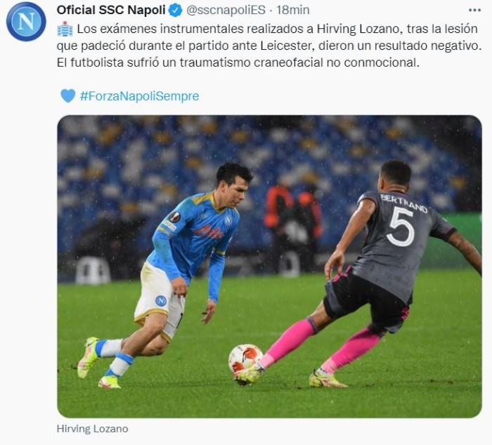 Hirving "Chucky" Lozano volvió a protagonizar una escalofriante y desafortunada jugada, luego de impactarse con el rostro en la pierna de Wilfred Ndidi, en el partido de la sexta jornada de Europa League entre el Napoli y el Leicester City. Tras el choque, el "Chucky" fue sustituido. Los médicos lo inmovilizaron, le pusieron un collarín y lo trasladaron en ambulancia para realizarle las pruebas médicas necesarias. En un principio, se temía que el futbolista tuviera una fractura en el tabique nasal, sin embargo, el Napoli ya ha dado a conocer más detalles. A través de su cuenta de Twitter, el conjunto napolitano informó que los exámenes instrumentales realizados a Hirving Lozano, tras la lesión que padeció durante el partido ante Leicester, "dieron un resultado negativo". Y detallaron que el futbolista mexicano sufrió un traumatismo craneofacial no conmocional.El Napoli seguirá informando acerca de la salud del "Chucky" Lozano quien pareció vivir un Déjà vu, pues el pasado 10 de julio, en una jugada un tanto similar, terminó sufriendo una aparatosa lesión en el rostro, tras estrellarse en un jugador de Trinidad y Tobago. JL